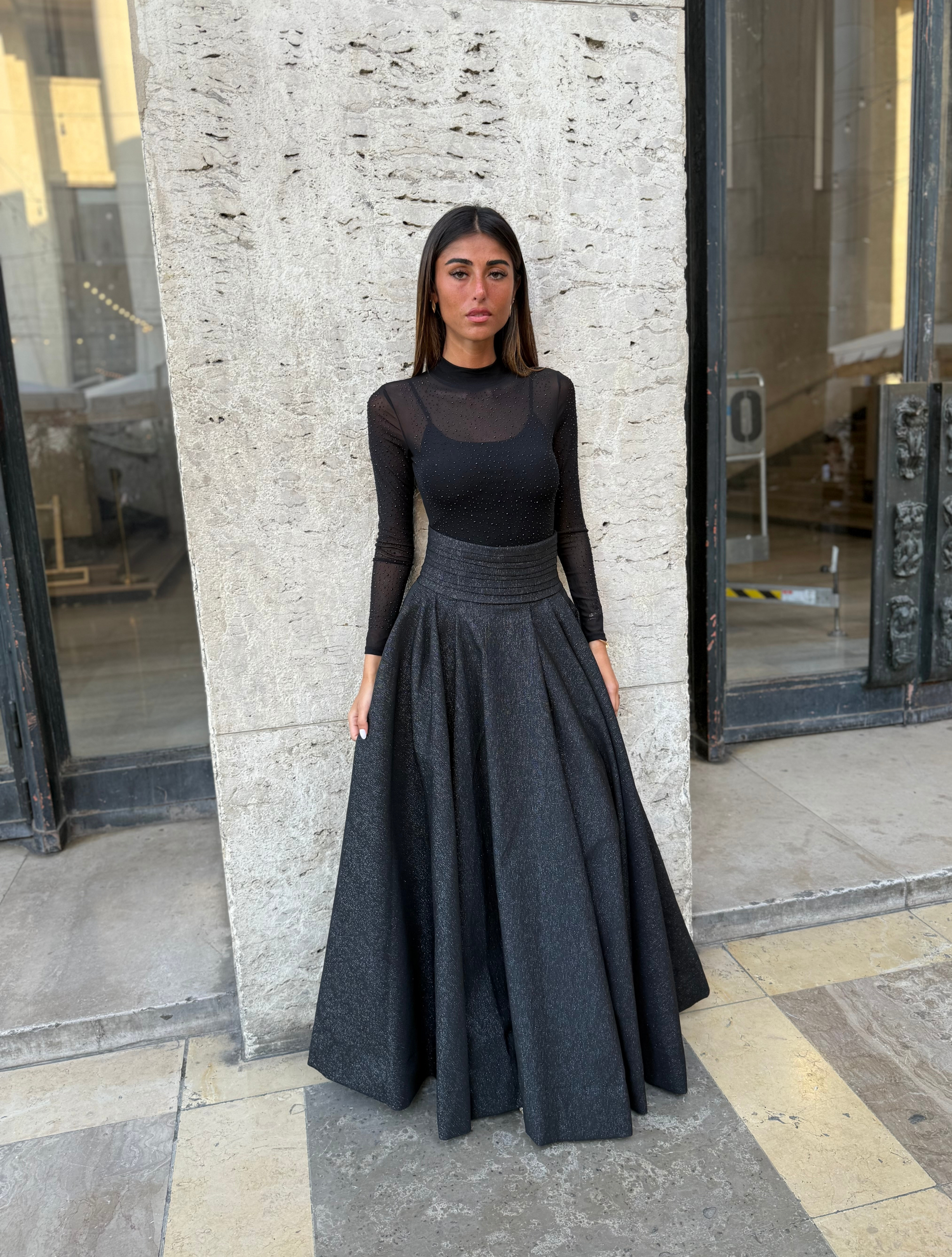 Sa coupe ample et majestueuse confère une allure aérienne, tandis que sa taille haute et ajustée structure la silhouette avec finesse, mettant en valeur les courbes avec une élégance intemporelle.