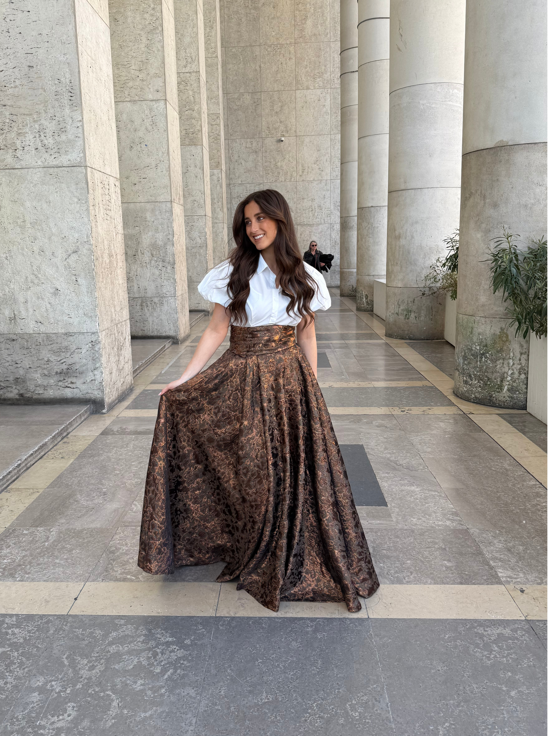 Cette jupe longue est une véritable pièce d’exception, mêlant luxe et sophistication. Son tissu richement texturé aux reflets dorés capte la lumière avec élégance, apportant une touche de glamour et de raffinement à chaque mouvement.