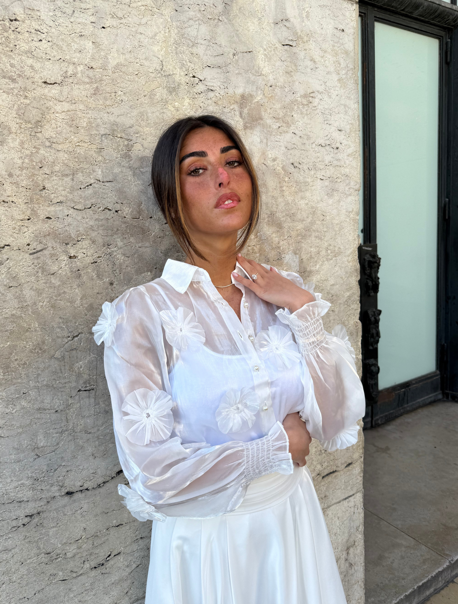 Ce chemisier blanc incarne l’élégance avec son tissu délicatement transparent et ses fleurs en relief.