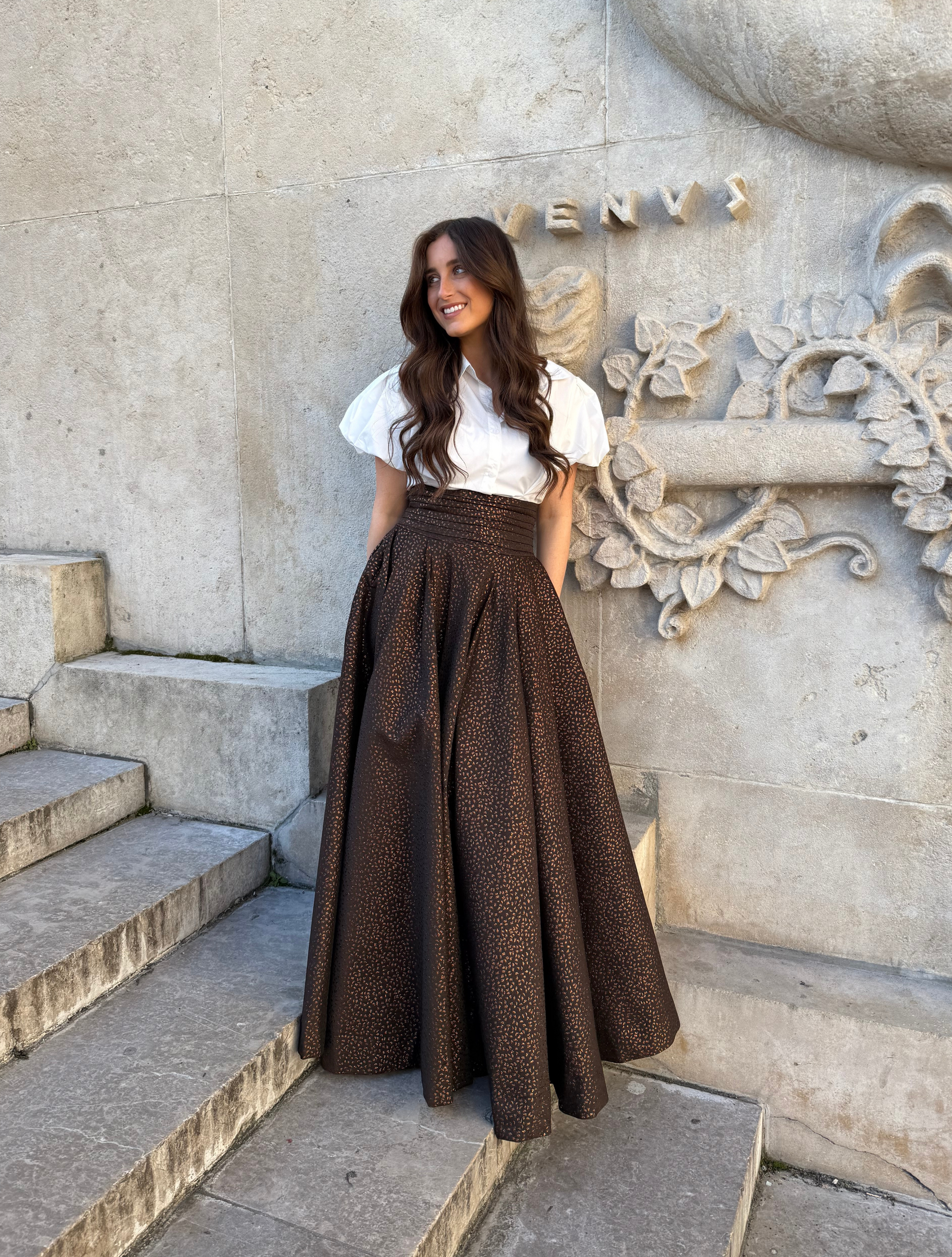Cette jupe longue allie élégance et raffinement avec une fluidité envoûtante. Confectionnée dans un tissu texturé aux reflets délicats, elle capte la lumière avec subtilité, apportant une touche de sophistication à chaque mouvement.