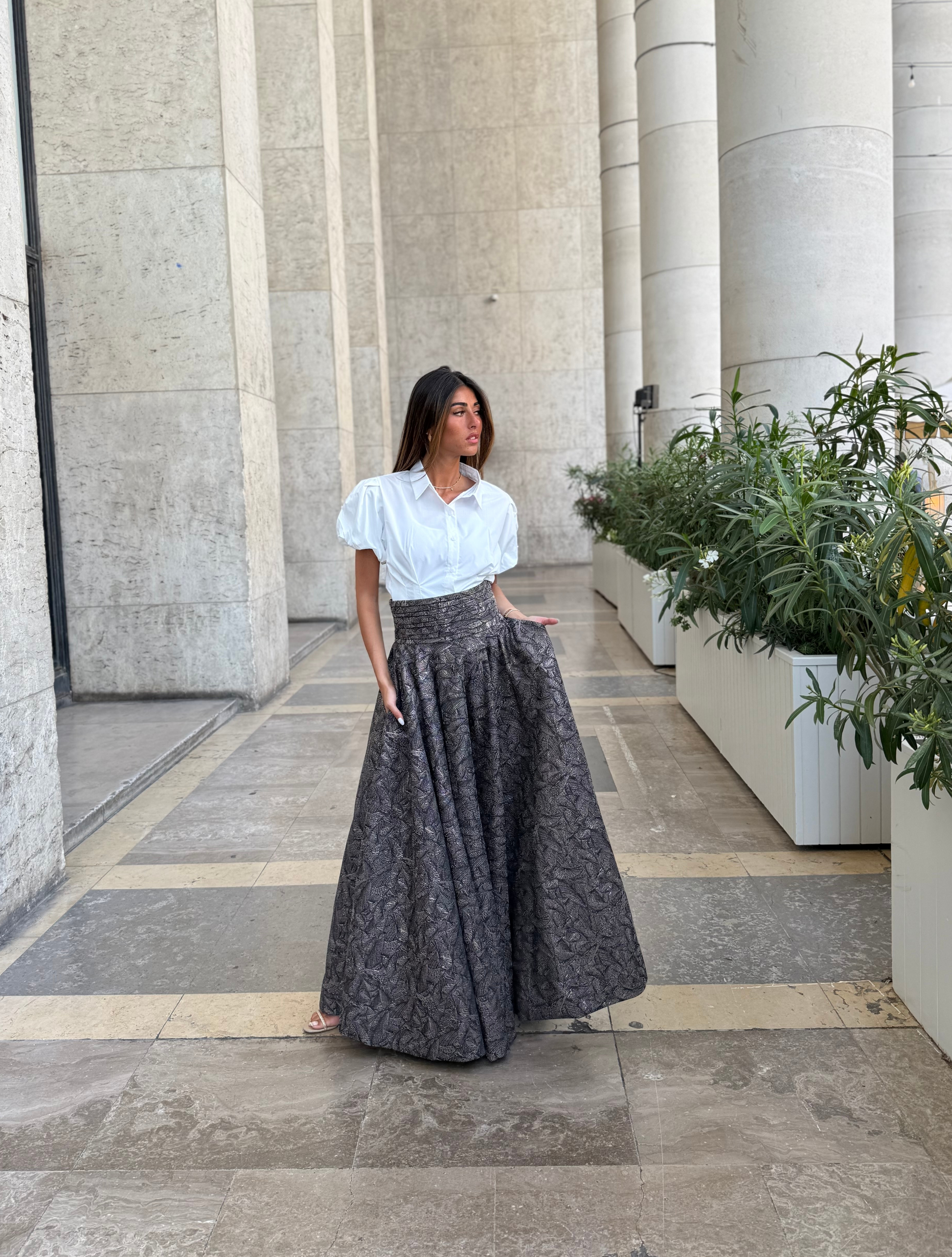 Cette jupe longue allie élégance et raffinement avec une fluidité envoûtante. Confectionnée dans un tissu texturé aux reflets délicats, elle capte la lumière avec subtilité, apportant une touche de sophistication à chaque mouvement.