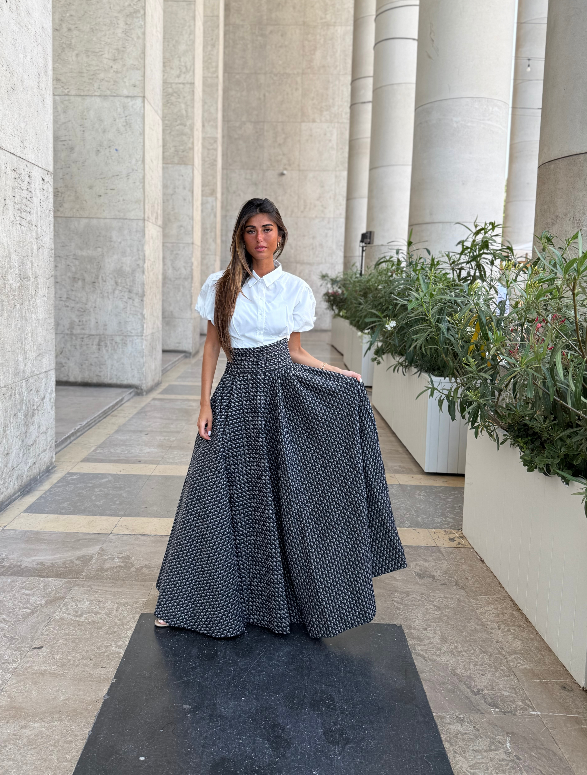 Cette jupe longue allie élégance et raffinement avec une fluidité envoûtante. Confectionnée dans un tissu texturé aux reflets délicats, elle capte la lumière avec subtilité, apportant une touche de sophistication à chaque mouvement.