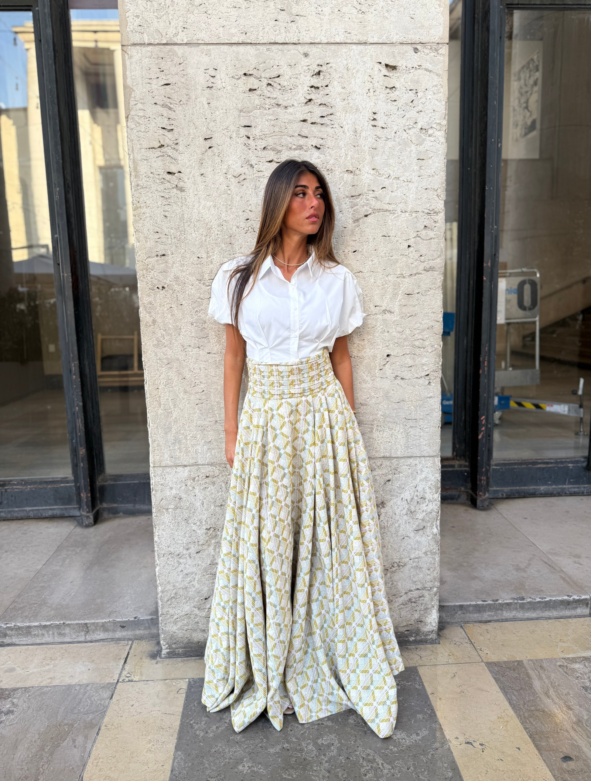 Cette jupe longue allie élégance et raffinement avec une fluidité envoûtante. Confectionnée dans un tissu texturé aux reflets délicats, elle capte la lumière avec subtilité, apportant une touche de sophistication à chaque mouvement.