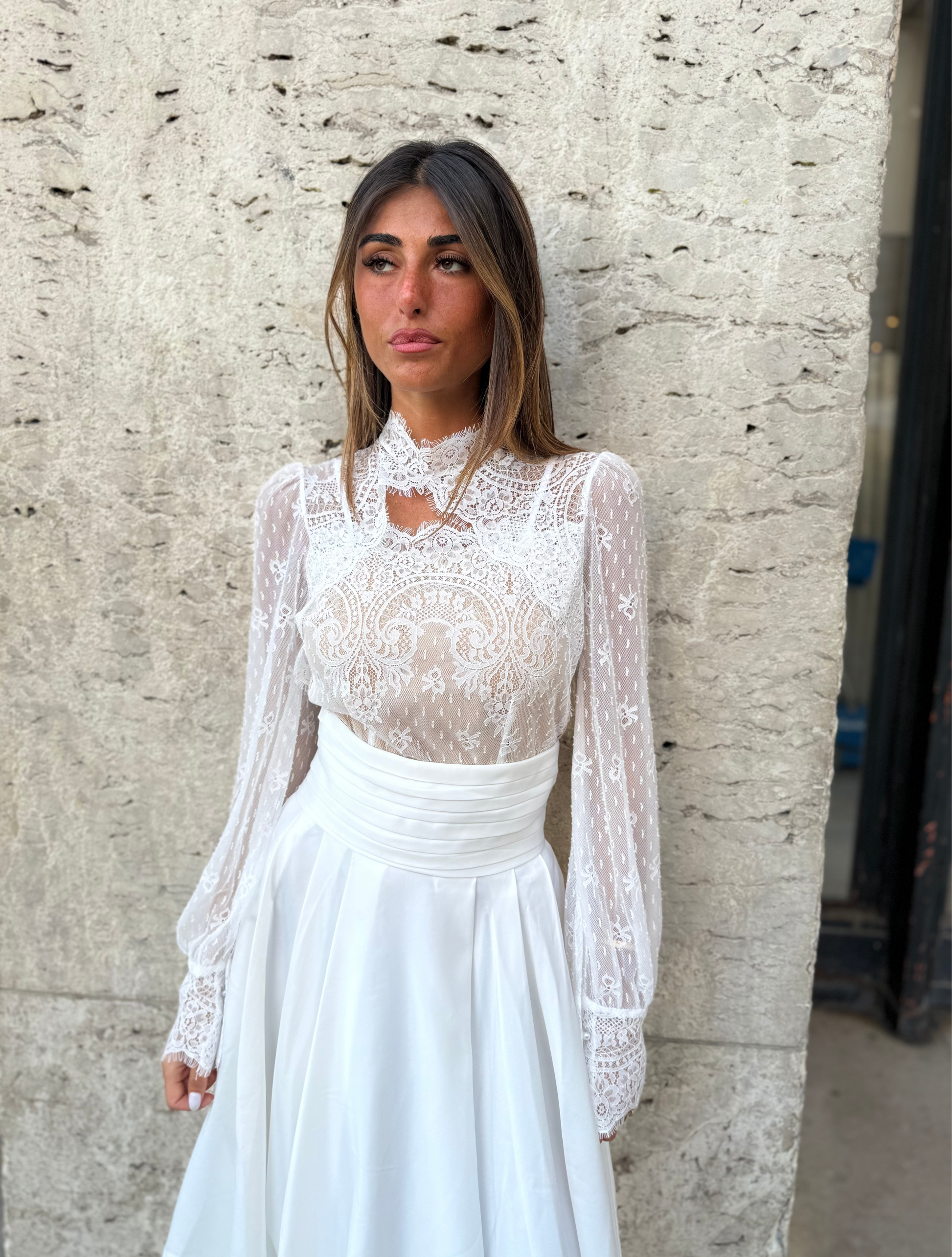 Ce chemisier en dentelle blanche incarne l’élégance et la délicatesse avec ses détails raffinés et sa coupe fluide.